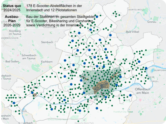 Aufgrund der vielen Beschwerden hat die Stadt in den vergangenen Jahren in Kooperation mit den Anbietern beim E-Scooter-Verleih bereits mehrfach nachgesteuert. So hat die Stadt bereits 165 Abstellflächen für E-Scooter eingerichtet, auf denen die Anbieter ihre Fahrzeuge bereitstellen und Nutzerinnen und Nutzer ihre Fahrten beenden können. In einem Umkreis von 100 Metern um diese Stationen gilt ein Parkverbot; dort können Nutzerinnen und Nutzer die Miete auch nicht beenden. Besonders im Bahnhofsviertel, wo die Stadt aufgrund der E-Scooter-Dichte mit dem Einrichten der Stellplätze begonnen hat, hat dies zu einer erheblichen Entspannung der Situation auf den Gehwegen und einer Verbesserung des Straßenbilds geführt. Inzwischen wurden solche Stationen in der gesamten Innenstadt eingerichtet sowie punktuell an weiteren Orten wie den S-Bahnhöfen in Griesheim und Berkersheim. Die Stadt hat sich bereits auf den Weg gemacht, die Stationen bis 2029 im gesamten Stadtgebiet einzurichten, sodass auch die äußeren Stadtteile von der verbesserten Ordnung profitieren.