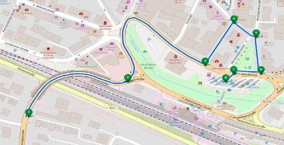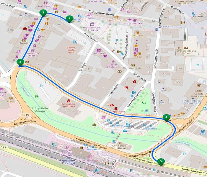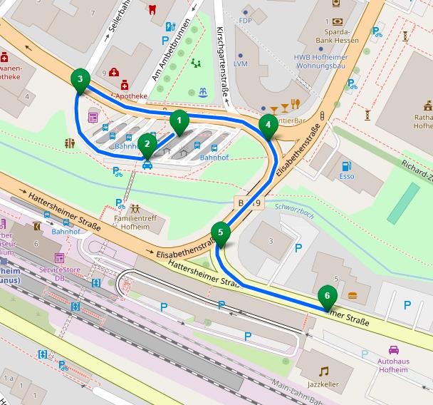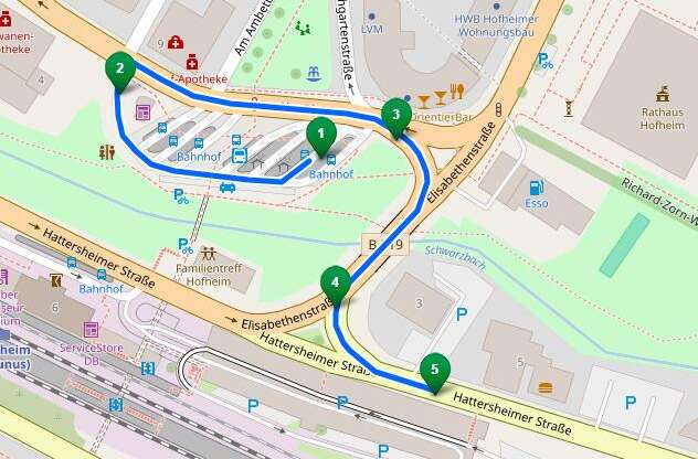 Achtung Ausnahme: Nur die Fahrten um 5.15 Uhr ab "Wildsachsen Parkstraße", die S-Fahrt um 6.58 Uhr ab "Wildsachsen Parkstraße" und die S-Fahrt um 7.08 Uhr ab "Langenhain Siedlung" fahren den Hofheimer Bahnhof über eine Sonderumleitung an. Sie halten an der Haltestelle "Seniorenresidenz" und folgen dann dieser Route: Cohausenstraße, Am alten Bach, Am Untertor, Kirschgartenstraße. Die Haltestelle "Rheingaubrücke" entfällt während dieser Fahrten.