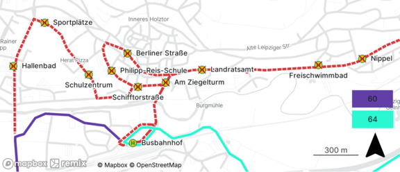 Linie 64: Nippel, Freischwimmbad, Landratsamt, Berliner Straße, Phillip-Reis-Schule, Am Ziegelturm