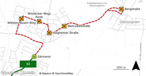 Die Linie 33 beginnt und endet in Bruchköbel an der Haltestelle „Gärtnerei“.