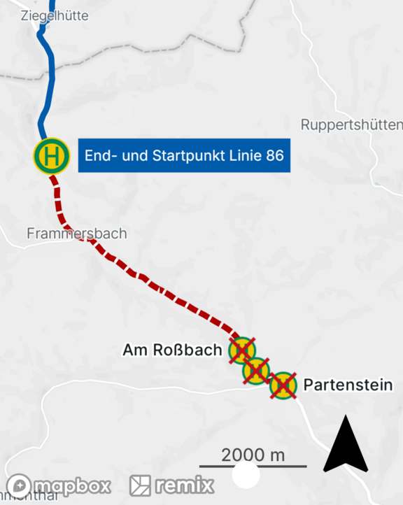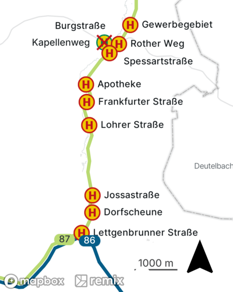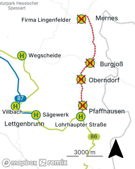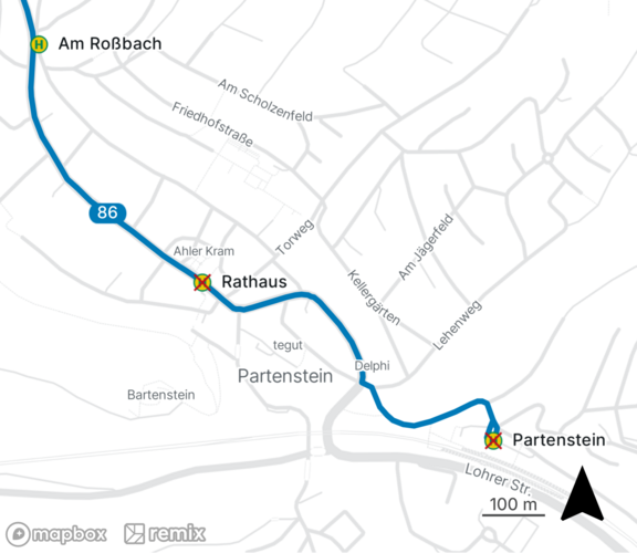 Die Linie 86 beginnt und endet im oben genannten Zeitraum an der Haltestelle „Am Roßbach“ in Partenstein. Die Haltestellen „Rathaus“ und „Bahnhof“ können nicht bedient werden.
