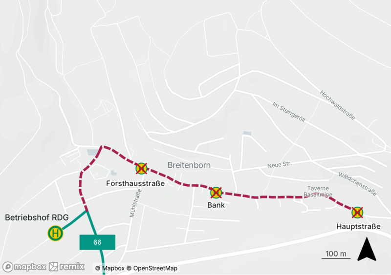 Die Haltestellen „Forsthausstr.“ „Bank“ und „Hauptstr.“ in Breitenborn entfallen.