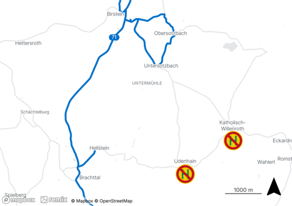 Die Linie 71 fährt von der Haltestelle „Alte Schule“ in Hellstein zum „Busbahnhof“ in Birstein.