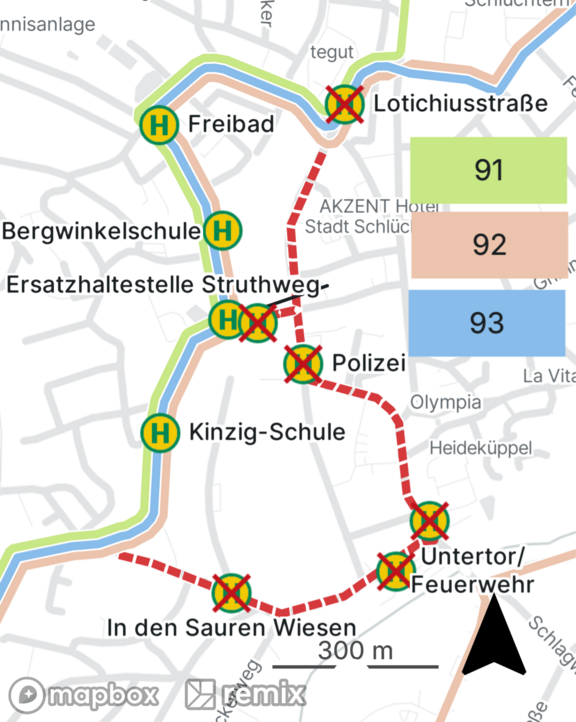 Aufgrund der Sperrungen können die Haltestellen „Ulrich-von-HuttenGymnasium“, „Untertor/Feuerwehr“, „In den sauren Wiesen“, „Hallenbad“, „Polizei“ und „Stadtschule“ nicht bedient werden. Fahrgäste werden gebeten an die Haltestelle „Kinzig-Schule“ oder der eingerichteten Ersatzhaltestelle im Struhtweg (in Höhe des Parkplatzes an der Einmündung zur Bahnhofstraße) auszuweichen.