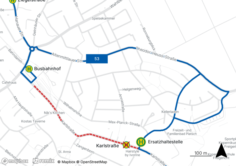 Die Haltestelle „Karlstraße“ kann nicht bedient werden. Eine Ersatzhaltestelle wird in der Trenngasse eingerichtet.