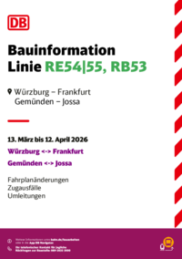 Bauinformation Linie RE54|55, RB53 Würzburg – Frankfurt Gemünden – Jossa 13. März bis 12. April 2026 Würzburg Frankfurt Gemünden Jossa Fahrplanänderungen Zugausfälle Umleitungen Weitere