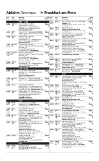 …5:38 ICE 521 5:47 * h ICE 222 yh Fern 5 ICE 826 y Limburg Süd 6:14 Q ô Köln/Bonn Flughafen 6:57 – Köln Messe/Deutz 7:14 – Düsseldorf Hbf 7:37 – Duisburg Hbf 7:51 – Essen Hbf 8:04 Fern 7 6:07 Sa, So* f …